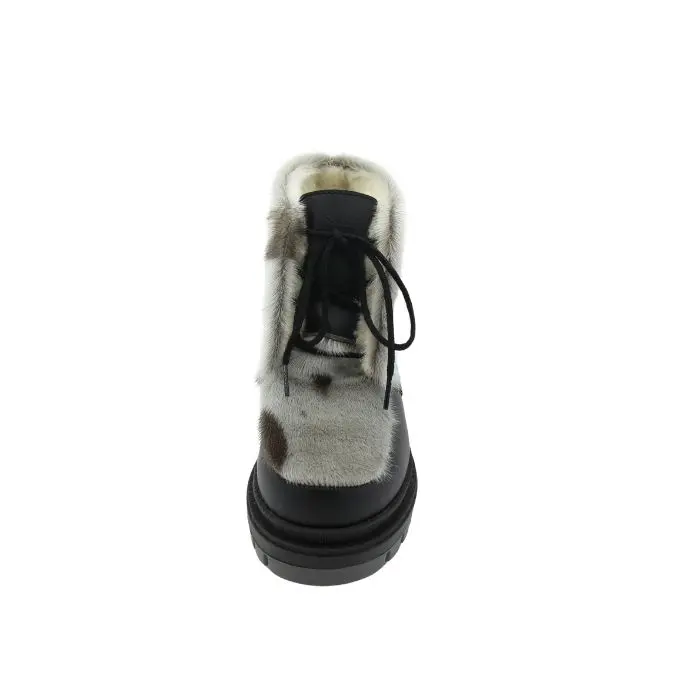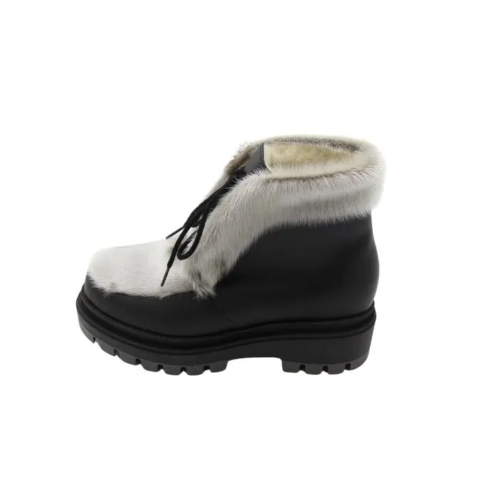 Notre modèle Anne est fabriqué en cuir noir avec du phoque de qualité supérieure. Entièrement doublée en peau de mouton, c’est une botte d’une chaleur exceptionnelle — difficile d’en trouver une plus chaude pour affronter l’hiver! Ses lacets lui donnent un look classique et un ajustement précis; veuillez noter qu’il n’y a pas de fermeture éclair à l’intérieur.