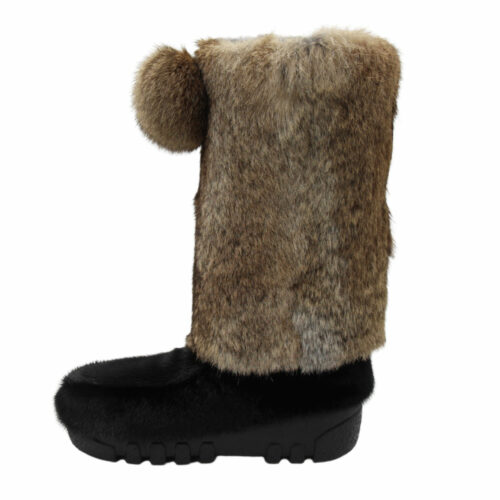 Ces bottes hiver femme en loup-marin avec pompons de lapin beige sont un peu plus longues (15 pouces comparativement à 12) que la botte classique. Le jeu de la densité et des longueurs de poil entre le pied et la jambe donne une impression de petits pieds. En effet, c’est un mélange particulièrement magnifique de fourrures pour un look plus urbain qui vous tiendra au chaud tout en vous donnant fière allure.